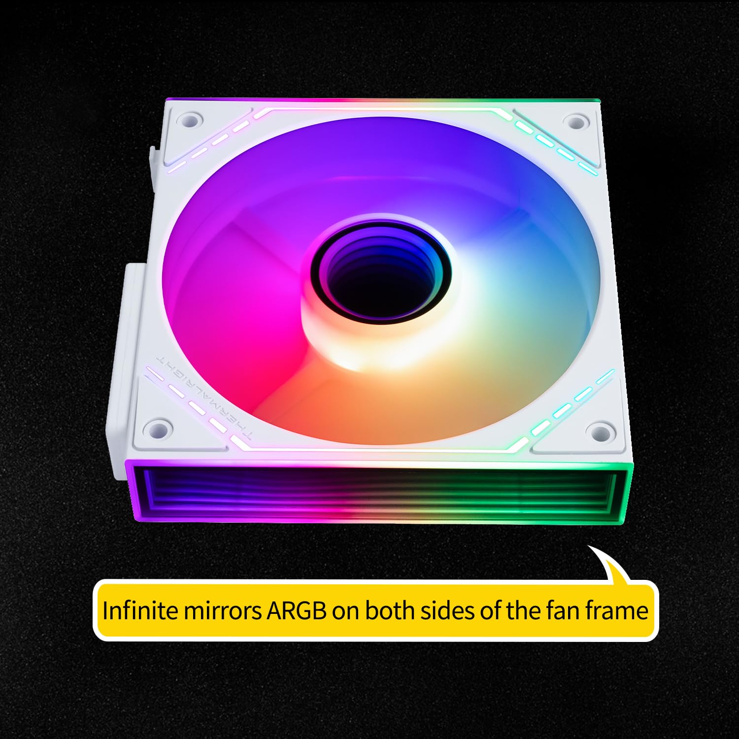 - [ARGB Infinite Mirror] The two sides of the pc fan have an infinite frame structure and a segmented light effect design. There is a slender segmented LED light strip on both sides of the fan frame, giving the fan a rich ARGB lighting effect.